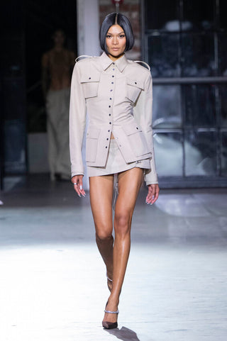 Smith took the classic and usually demure houndstooth print and fashioned it in pony hair for a patent leather-trimmed cropped jacket and a pencil skirt with an ultra-high slit. Nipped waist blazers in wool and tweed—along with a silk pussybow blouse marked by shimmery pinstripes—screamed office siren. Though Smith leaned into tailoring with suiting separates embellished with mini heat-set crystals and a pair of cummerbund trousers, “I don't want to forget about my woman who is obsessed with her body and loves to go out and have a great time and really be empowered by her own humanity.” To that end, Smith revived his telltale catsuits—one in black lace that was completely sheer, save for a small strip of fabric between the legs that would prevent an indecent exposure arrest.