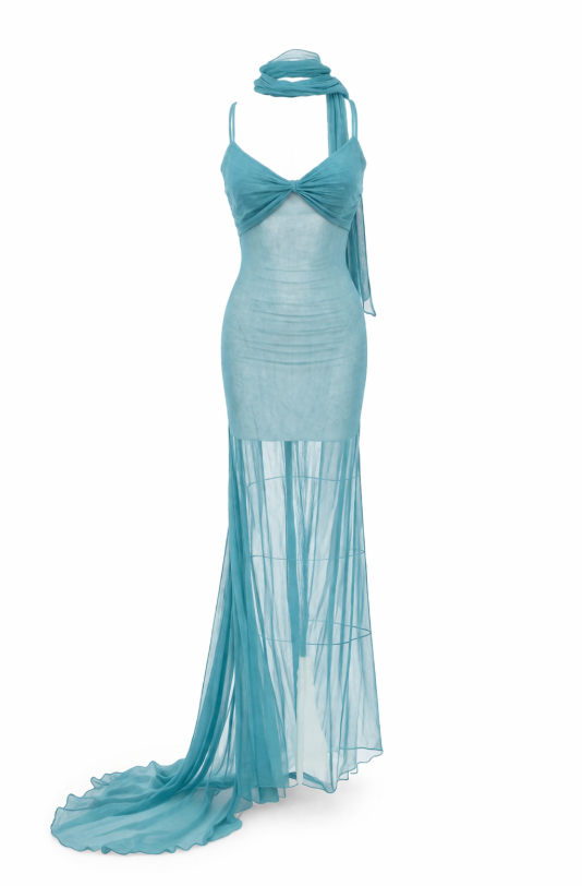 An ethereal, floor-length gown, designed to contour the body with a powerful, liquid-like luster. This high-impact silhouette features a knotted sweetheart neckline, delicate spaghetti straps, and a dramatic pooling train. It is completed with a versatile, voluminous neck tie that can be artfully draped for a custom evening profile. Dry clean only.