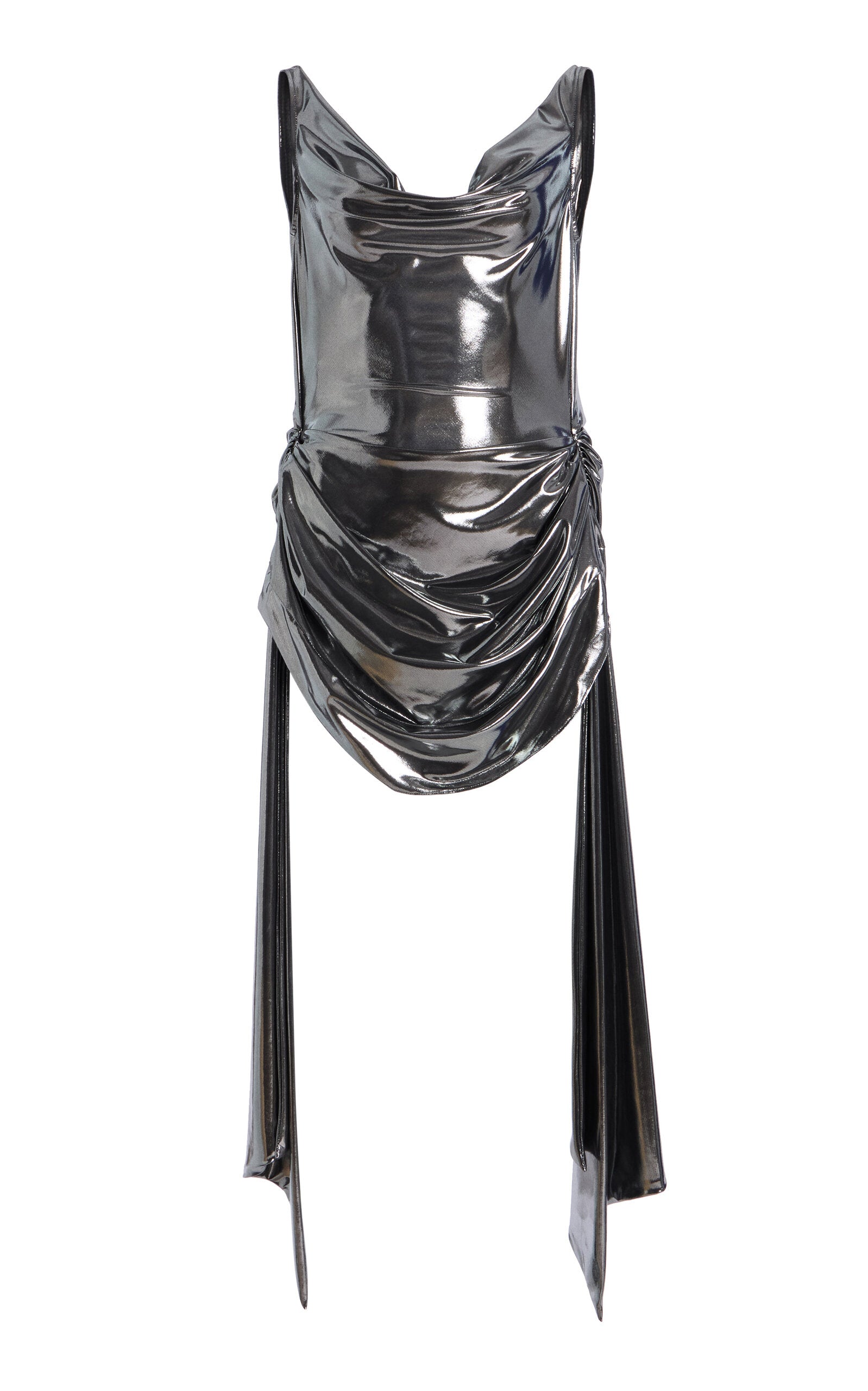 Crafted from slinky metallic fabrication, this party dress is gathered and draped, especially along its back.