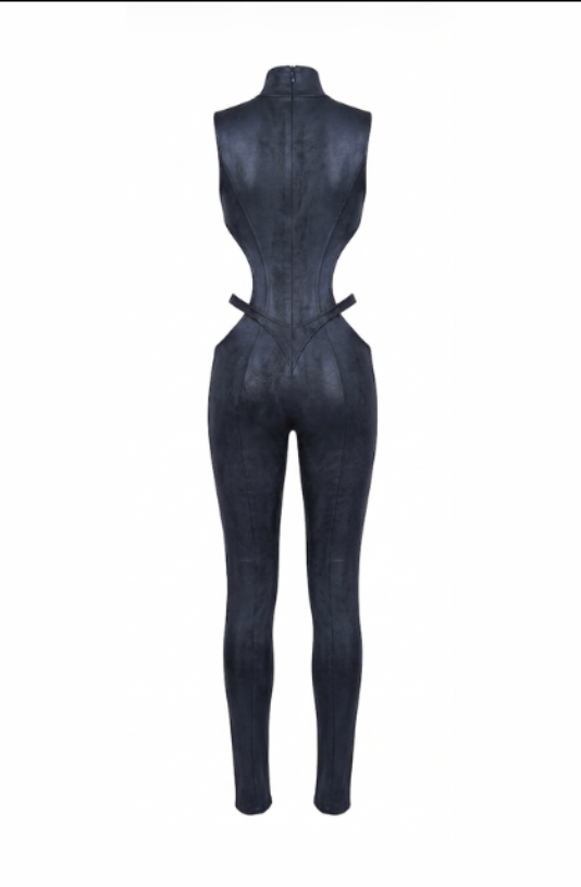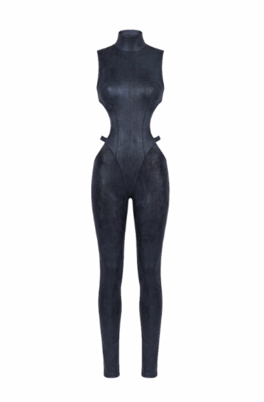 A high-neck, sleeveless catsuit designed to sculpt a dramatic hourglass silhouette. This striking piece features symmetric side-waist cutouts, precision-seamed architectural paneling, and an invisible back zipper for a seamless, second-skin fit. Dry clean only.