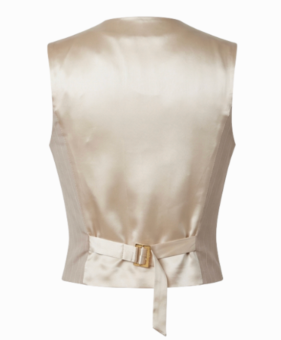 A sharp, pinstripe vest meticulously tailored for a body-sculpting fit. This structured piece features a deep V-neckline, tonal button closures, and decorative welt pocket detailing at the chest. The back is finished in a luxe satin with an adjustable gold-tone buckle for a customizable cinched waist. Dry clean only.